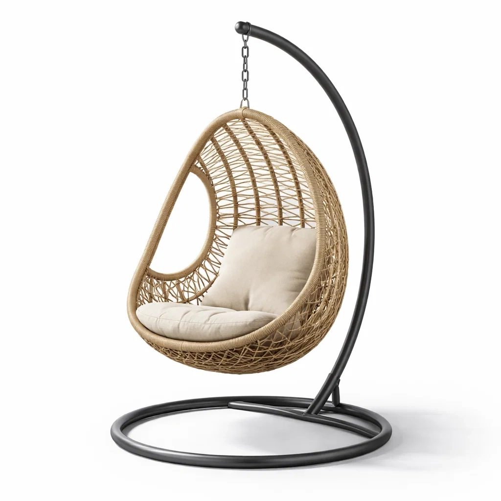 Poltrona sospesa a uovo in rattan con struttura in metallo